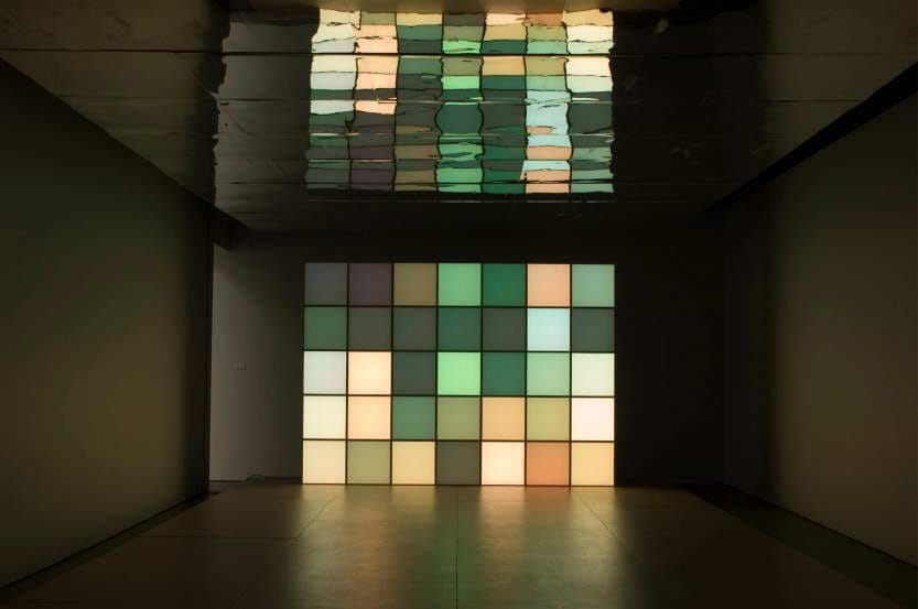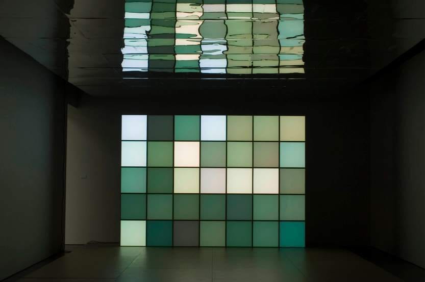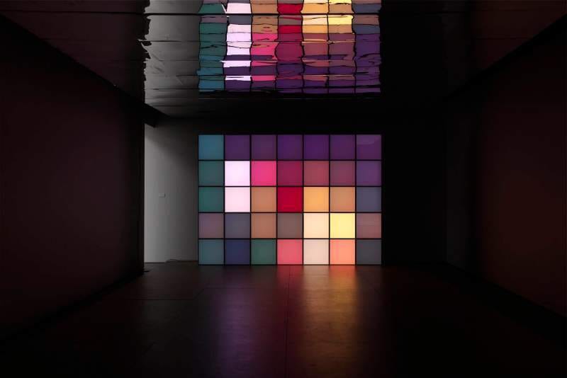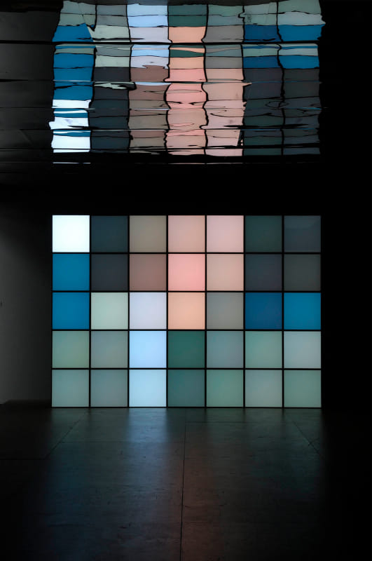 - 35 pixel boxes, elk 50 x 50 x 50 cm, houten plateau en spiegelend plafond elk 700 x 500 cm