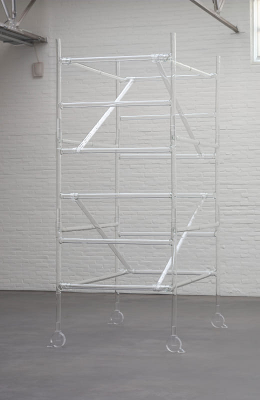 Ook de realiteit van kunstwerken zelf is vaak tijdelijk: ze worden opgehangen, geïnstalleerd en vervolgens verplaatst of gewist, opgeslagen, op- of ontvouwen. Uit Work 1 spreekt de slanke maar onbedoeld esthetische vorm van deze stellage, die maximale stevigheid koppelt aan maximale tijdigheid. Banner speelt met het gevoel van duizeling dat onlosmakelijk verbonden is met een dergelijk architectonisch object, dat kan worden veranderd en aangepast aan de specifieke context of de gewenste functionaliteit waarin het ons fysiek van de grond tilt. Door glas te gebruiken voor iets wat is bedoeld om steun te bieden, toont Banner de inherente breekbaarheid van het medium waarmee ze werkt. Zo maakt ze een constructie die speelt met tegenstellingen, die aanwezig is maar afwezigheid suggereert, die is gemaakt van een hard materiaal maar toch doorzichtig is. Een steiger is een vorm die wordt geassocieerd met de voorbereidingen voor een tentoonstelling, het maken van een kunstwerk, maar die altijd wordt verwijderd voor de opening. Hier wordt de steiger zelf de sculptuur, het belangrijke tentoonstellingsobject.