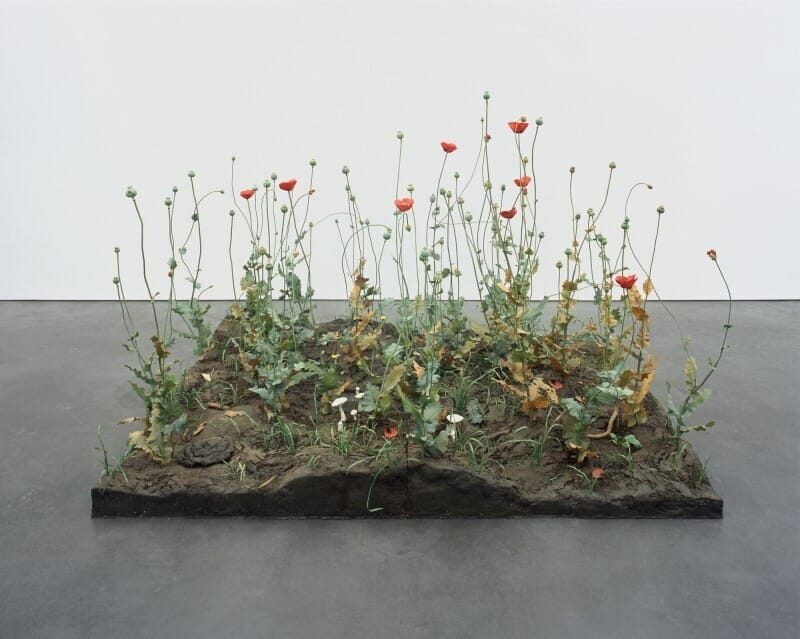 De paddestoelen, papavers, grassen en andere planten die we in het realistische werk van Roxy Paine aantreffen, zijn gemaakt van kunststoffen en met de hand beschilderd. Ze zien er volstrekt natuurlijk uit en zouden deel kunnen uitmaken van een diorama of een botanische inventarisatie. Crop (1997-98, collectie De Pont) bestaat uit een veld van levensechte papavers waarvan de bloemen en zaadbollen op hoge stelen dansen. Het is geen toeval dat deze vegetatie in werkelijkheid hallucinerend is. Als kind van zijn generatie is Paine al vroeg geconfronteerd met het experimenteren met drugs. In zijn kunst lijkt hij dit echter te hebben gesublimeerd door geestverruimende planten en paddestoelen met geconcentreerde precisie in eindeloos veel replica’s te transformeren. De zinsbegoocheling ligt niet meer in het gebruik van deze soorten, maar in het besef dat ze hier allemaal nep zijn.